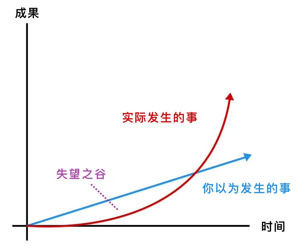 作为个体我们应该构建一个更加细致的衡量标准,通过细腻、微小的进步构建正反馈,激励我们持续下去。如果一致关注着宏观尺度的「社会标准」我们则很容易陷入「失望之谷」,最终在对自己的一次次失望中选择放弃。